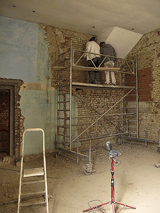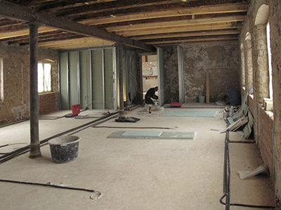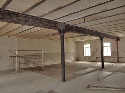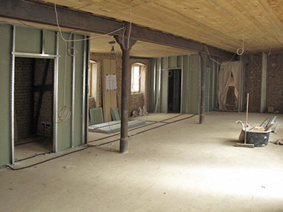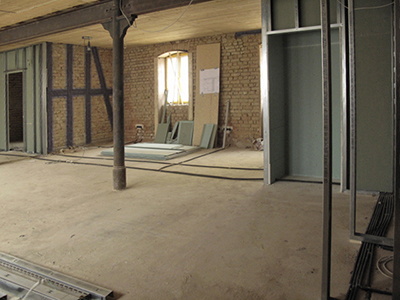 Trockenbau und Elektroinstallation im ersten Obergeschoss des Südflügels. Hier wird ein Künstleratelier entstehen. |