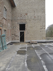 Entfernung des Wandputzes im Turm und erweiterte Türöffnung zur Terrasse über dem ehemaligen Getreidelager. |
