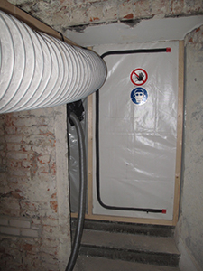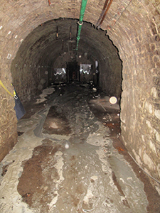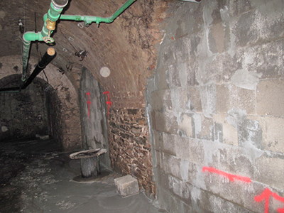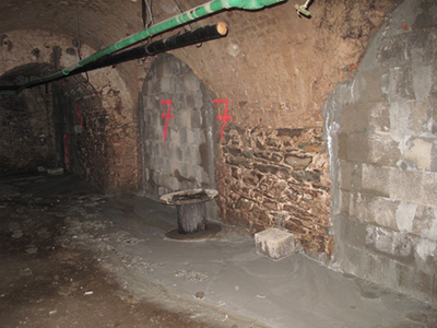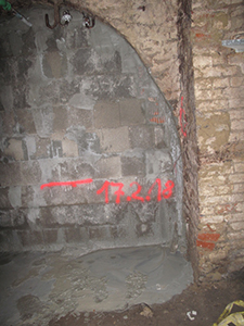17.02.2018 Die hinteren, parallel laufenden Gewölbesegmente im Eiskeller wurden zugemauert, da die Bereiche jenseits davon mit einem Betongemisch verfüllt werden. Diese Verfüllung ist aus statischen Gründen notwendig, da über diesen Eiskellerteilen, die weit in den Hang der Liegenschaft Walkmühle hineinreichen, in Kürze mit dem Bau eines Mehrfamilienhauses begonnen werden soll. Das Datum auf der Vermauerung zeigt den aktuellen Füllstand des Betongemisches jenseits der Mauer an. Durch Fugen und Ritzen sickert ein Wenig des Gemisches hindurch. Die Vorstellung, dass jenseits der Mauer ein Teil historischer Baugeschichte für immer in Hunderten von Kubikmetern Beton versinkt, ist beklemmend. Aber angeblich unerlässlich denn die Neubebauung mit Wohnhäusern ist für eine Finanzierung des Gesamtsanierungsvorhabens der Walkmühle notwendig. |