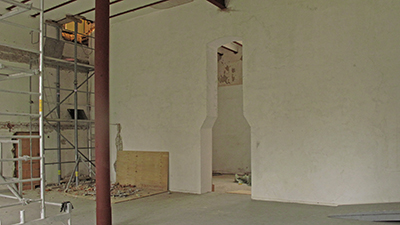 01.10.2019 Rostschutzanstrich auf der zentralen Säule und den Deckenträgern des großen Saals. In der Raumecke lässt sich deckenseits der für die Treppe zum Dachgeschoss erforderliche Durchbruch erkennen. |
