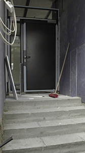 Treppe und Tür zum Dachgeschoss des Brauhauses. Um den Treppenzugang herzustellen, musste die Decke über dem großen Saal parziell geöffnet werden. Von der zweiten Treppenstufe sieht man daher nun temporär hinunter in den Saal. |