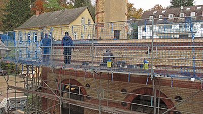 Verputzarbeiten mit neuen Simsen auf der Nord- und Westseite des Malzhauses. |