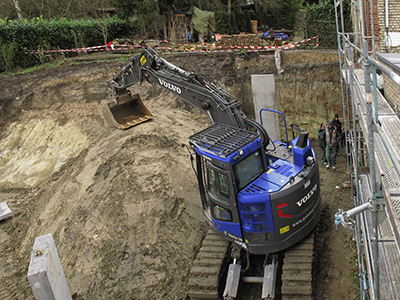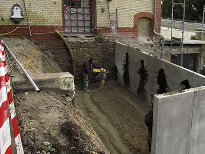 30.01.2020 Fertigbetonteile zur Abstützung der Terrasse im Bereich des Pferdestalls, schichtweise Aufschüttung und Verdichtung mit Erdmaterial. |
