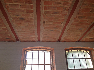 Gestrichene Eisenträger und Deckenziegel im Erdgeschoss des Pferdestalls.