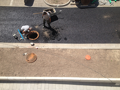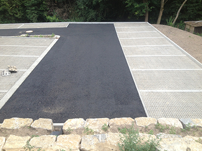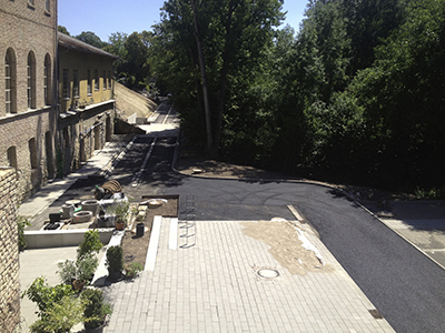 Die erste Asphaltschicht im Bereich der unteren Zufahrt und der Parkplätze ist aufgebracht worden