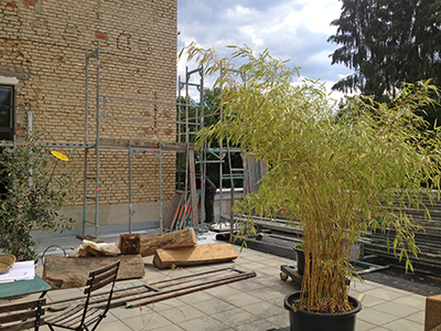 14.07.2020 Terrasse des Getreidelagers. Beginn der Einrüstung des Turms. |