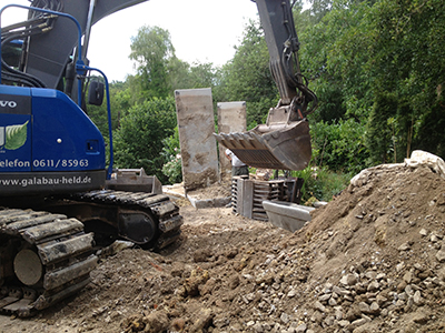 15./16.07.2020 Die neu gesetzten Stützmauerelemente an der Terrasse des Pferdestalls. |