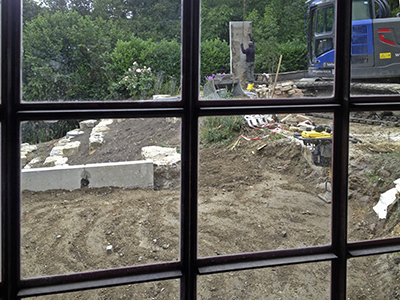 "Schlachtfeld" mit Aushub im Garten des Pferdestalls nach dem erneuten Ausgraben der bereits gesetzten aber abgesackten Betonstützmauerelemente. | |