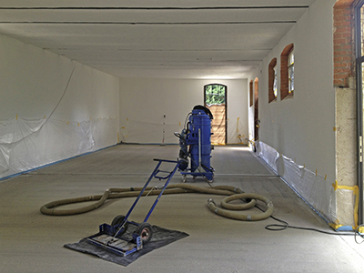 02./03.09.2020 Links: Großes Atelier im Pferdestall EG:Vorbereitung des Estrich-Untergrundes für den Guss des Feinestrichs. Rechts: Gegossener Feinestrich im kleineren Atelier. |
