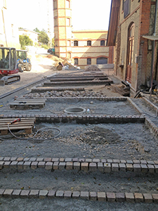 Aus Pflastersteinen verlegte Abgrenzungsmarkierungen für die Parkplätze vor dem Pferdestall. |
