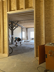 Kühlschiff: Beplankung der Holzständerkonstruktion mit OSB-Platten im Flur zu den späteren Toilettenanlagen und im Zwischenlager vor dem großen Veranstaltungsraum. |