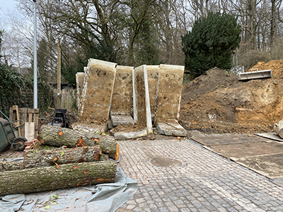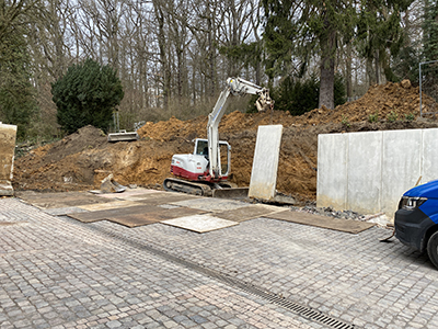 Die Beton-L-Profile der Hangbefestigung am Haus Esch muß rückgebaut bzw. versetzt werden. Sie stand teilweise auf der Fläche zweier geplanter Parkplätze und damit an der falschen Position. |