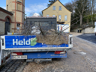 Ein neuer Ahorn wird am Hang unterhalb des Pferdestalls gepflanzt. |