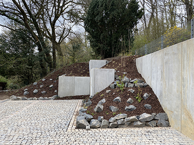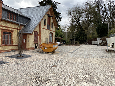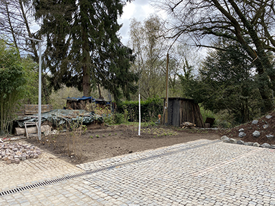 16.04.2021 Gepflasterte Bereiche und Parkplätze im Bereich vor dem Mühlengebäude und dem Pferdestall – mit neu angelegtem Hang. |