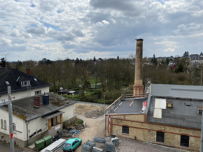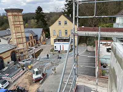 19.04.2021 Blicke vom Neubau auf das Kernensemble der Walkmühle. |