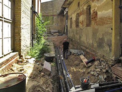 17.08.2017 Vorbereitungen für das Absanden der verlegten Heizungsleitungen im Versorgungsgraben am Sudhaus (links) und bereits abgesandeter Graben am Pferdestall. |