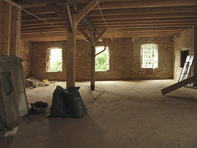 07.08.2017 Fertig aufgemauerte Fenstersimse und -wangen im zukünftigen Künstleratelier im Erdgeschoss des Malzhauses (links) und Blick im Obergeschoss zur Südseite. |