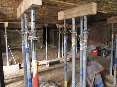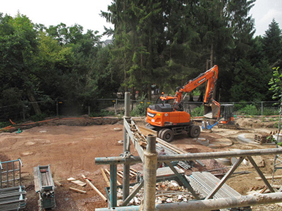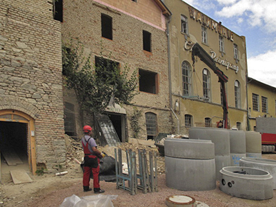 Im "Vinotto" sind die gewölbetragenden Säulen entfernt. Während vorne noch ausgeschachtet wird, ist im hinteren Gewölbe bereits die neue Fußbodenplatte gegossen. |
