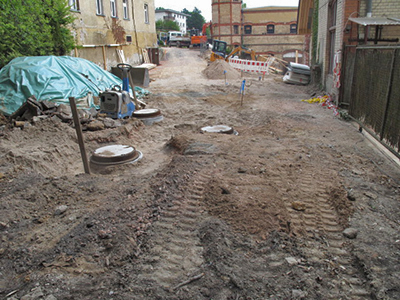 24.04.2017 Grabungsarbeiten für die Verlegung der Versorgungsleitungen im Bereich zwischen Sudhaus, Malzhaus und Kühlschiff ("Scheune"). |