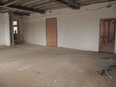Malzhaus Erdgeschoss: Abbruch der Wand zwischen ehemaligem Ausstellungsraum und Treppenhausflur. |