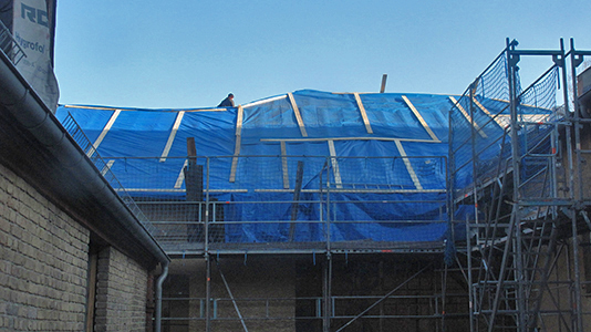 14.02.2017 Das abgedeckte und durch Planen geschützte Dach des Malzhauses. |
