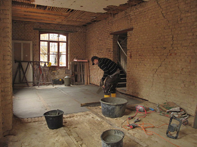 Estricharbeiten auf dem ausgebesserten Tonnengewölbe im Erdgeschoss des Südflügels. |