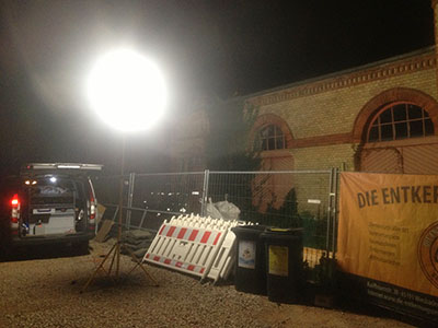 Gemeinsamer Späteinsatz mit dem unermüdlichen Leiter der Tiefbauarbeiten: Testlauf der Sicherheitsbeleuchtung im Eingangsbereich des Künstlervereins. So hell war es nachts in der Walkmühle noch nie! |