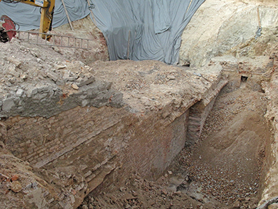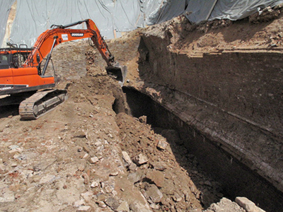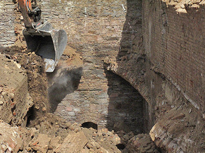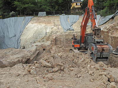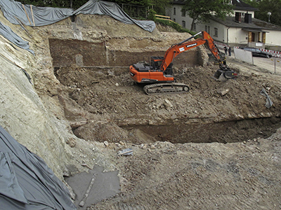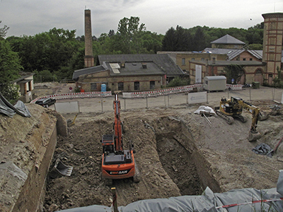 02.05.2018 Abbrucharbeiten an den ehemaligen Eiskellern. Mit dem Blick von oben erschließen sich die Dimensionen des Mehrfamilienhauses, das hier entstehen wird. |