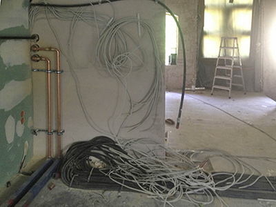 09.08.2018 Südflügel Dachgeschoss: Verlegung von Elektrik, Wasser- und Heizungsleitungen. Hier entsteht ein Gemeinschaftsatelier mit zugehöriger Bad- und Teekücheneinheit. |