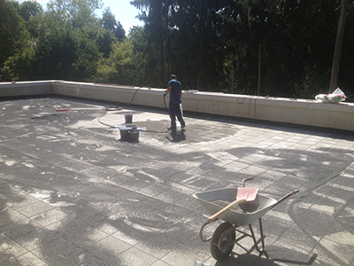 Die Fugen der neu gelegten Bodenplatten auf dem Dach des Getreidelagers werden mit feinem Splitt verfüllt. |