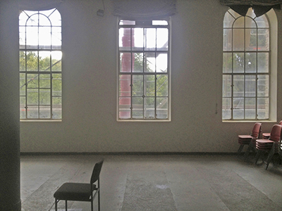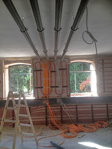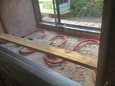 17.10.2018 Obergeschoss Getreidelager: Gut sichtbar die Schleifen der Wandheizung, die sich auch durch die Leibungen der Fensteröffnungen zieht. |