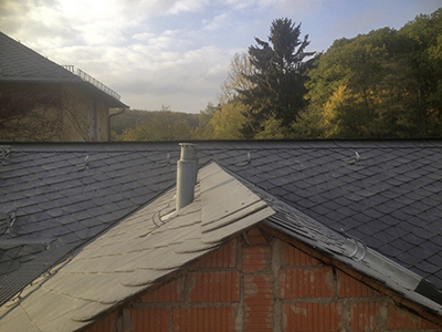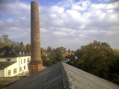 Aussichten vom Dach des Brauhauses auf Scheune und Schornstein und in die Gegenrichtung auf den Quergiebel und das neu gedeckte Dach des Malzhauses. | |