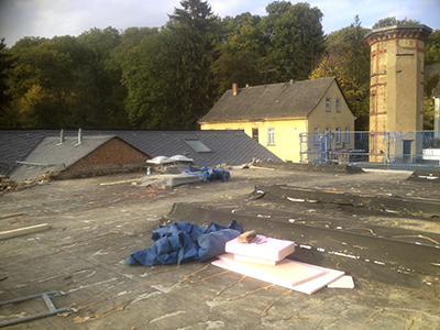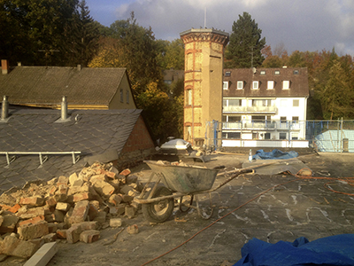 Sanierung des Daches vom Brauhaus. Die marode Brüstungsmauer wird abgetragen. |