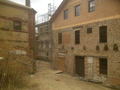 Innenhof vor dem Brauhaus: Der alte Putz wird abgeschlagen und das ursprüngliche Mauerwerk wieder sichtbar. |