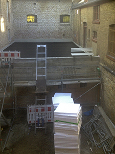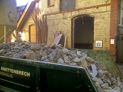 05.11.2018 Der Abbruch der Bodenplatte und des alten Sockels unter der Treppe im vorderen Bereich des Pferdestalls. Der Übergang zum restlichen Teil des Bildhauerateliers von Christiane Erdmann ist provisorisch abgedichtet. |