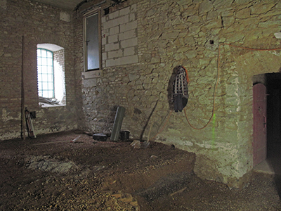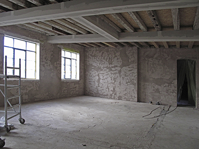 06.01.2019 Links: Das spätere Atelier im Malzhaus EG hat seine erste Putzschicht erhalten. Rechts: Das künftige Gemeinschaftsatelier im Dachgeschoss des Pferdestalls ist bereit für die abschließende Feinestrich-Schicht. |