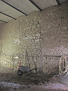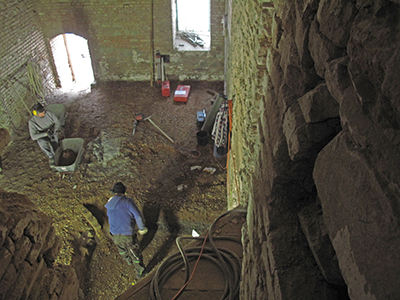 Untergeschoss des Treppenhausturms: Ausschachtungs- und Armierungsarbeiten für die Treppenfundamente. Gut sichtbar: Die neu eingezogene Geschossdecke im Stil von "Preußischen Kappen". |