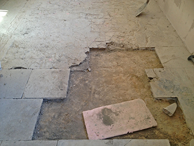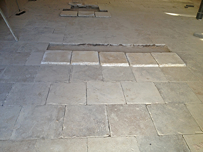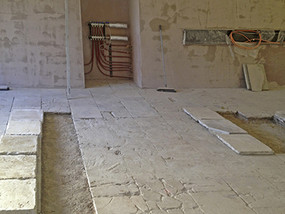 09.02.2019 Im Kellergeschoss des Pferdestalls werden schöne und intakte Solnhofener Kalksteinplatten vom alten Fußboden geborgen. |