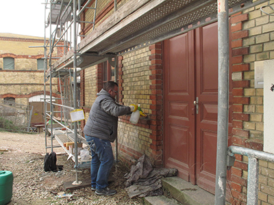 25.02.2019 Einbau des neuen großen Fensters im Obergeschoss des Malzhauses. |