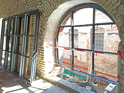 11.04.2019 Einsetzen der großen Bogenfenster im Sudhaus. |