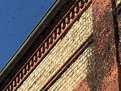 Trotz der Baustellenaufregung: "Unsere" Bienen sind wieder da! Sie wohnen im Hohlraum zwischen dem doppelwandigen Mauerwerk des Sudhauses. An ihren Honig wird niemals ein Imker herankommen! |