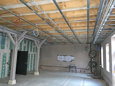 24.04.2019 Verkabelungen im Veranstaltungsraum des Malzhauses. Hier wird nicht nur Strom verlegt, sondern auch Video- und Audiokabel mit Wand- und Deckenauslässen. |