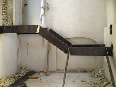 30.04.2019 So beginnt eine Treppe! Die ersten Stahlwangen der komplexen, alle Stockwerke erschließenden Treppe im Turm bzw. Südflügel wurden montiert. |