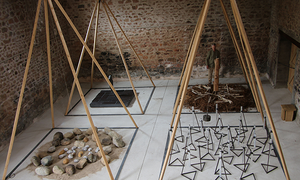 Die neue, von Axel Schweppe kuratierte Klangkunstausstellung in der Walkmühle zeigt raumgreifende, teilweise interaktive Klanginstallationen und sowie kleinere Klangobjekte des britisch-französischen Künstlers Will Menter, der Kölner Künstlerin Tina Tonagel und des in New York geborenen und in Wiesbaden gestorbenen Avantgardemusikers und Fluxuskünstlers Joe Jones. Will Menter ist nicht zum ersten Mal in der Walkmühle zu Gast: Bereits 2012 realisierte er zur Themenausstellung Klang eine große Klanginstallation aus hängenden und im Wind schwingenden Holzbrettern im Außenbereich und realisierte in diesem Kontext auch seine Performances Drips of Wood und Life Forms in der Walkmühle. Seine nun in der Ausstellung gezeigte Klangskulptur Inhabitation besteht aus vier fünf Meter hohen pyramidenförmigen Konstruktionen aus Eichenholz, die zusammen ein Pendelorchester bilden. An der Spitze jeder Pyramide ist ein Draht befestigt, an dessen Ende ein Gewicht hängt, das auf vier verschiedene Materialien auf dem Boden schlägt. Das Werk ist als Dauerperformance konzipiert, die vom Künstler Will Menter aktiviert wird. Sie erforscht eine sich ständig verändernde Musik, die durch das Zusammenspiel mit unterschiedlich stark bearbeiteter Materie entsteht: von Flusssteinen und Treibholz bis hin zu präzise gestimmten Aluminiumrohren. |